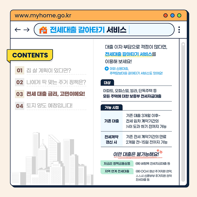 대출 이자 부담으로 걱정이 많다면, 전세대출 갈아타기 서비스를 이용해 보세요. 이외에도 신용대출, 주택담보대출 갈아타기 서비스도 있어요,