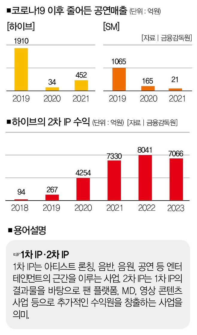 이런 성장 전략은 2020년 팬데믹 국면이 열리면서 조금씩 한계를 드러냈다. 사회적 거리두기 확산으로 업계의 공연 수익이 급감했기 때문이었다. 일례로, 하이브의 공연 매출은 팬데믹 전인 2019년 1910억원에서 팬데믹 직후인 2020년 34억원으로 90% 넘게 줄었다.