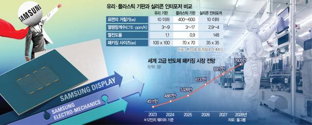 문제는 패키징에서 활용됐던 플라스틱 기판과 실리콘 인터포저가 한계에 다다르고 있다는 것이다. 플라스틱 기판은 표면이 거칠어 기판 위에 얇은 회로를 새기는 작업이 힘들다. 열에 약한 특성도 있어 열을 가해 칩을 접착하다 보면 기판이 휘어버리는 현상이 발생한다. 실리콘 인터포저는 플라스틱 기판의 문제를 상쇄한다. 그러나 전(前)공정에 쓰이는 값비싼 장비들로 생산라인을 꾸려야 해 비용이 크게 상승한다는 단점이 있다.
