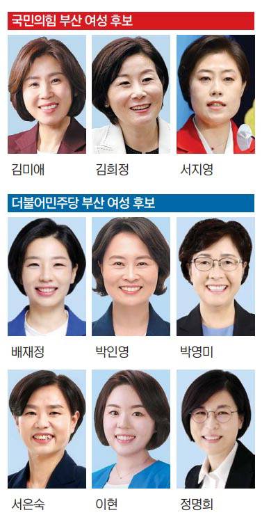12일 국제신문 취재를 종합하면 부산 18개 선거구에서 여야 여성 후보 총 9명(국민의힘 3명, 더불어민주당 6명)이 본선행을 확정지었다.