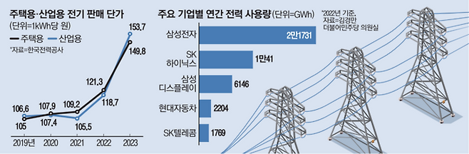 반도체를 비롯한 전력 다소비 업종 기업들의 경쟁력에 ‘빨간불’이 켜졌다는 우려가 나온다. 산업용 전기 단가가 계속해서 오르면 원가도 오를 수 있기 때문이다. 일례로 삼성전자는 2022년에 사용한 전력량을 유지만 하더라도 1년 사이에 7600억원 이상을 더 내야 한다. SK하이닉스는 2022년 전력사용량 기준으로 1년 새 3500억원 이상 전기요금 지출이 늘어난다.