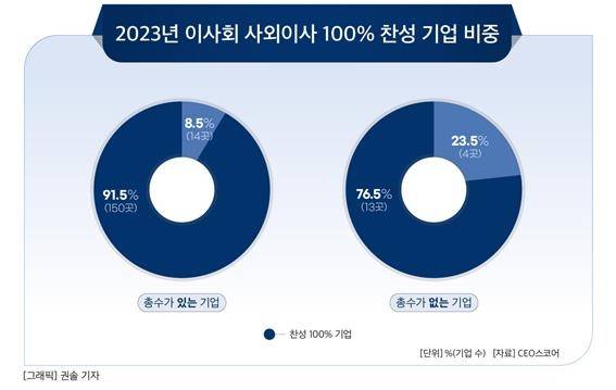 총수가 있는 기업 164곳 중에서는 150곳(91.5%)에서 사외이사가 이사회 안건에 100% 찬성했고, 총수가 없는 기업 17곳 중에서는 13곳(76.5%)에서 100% 찬성률을 보였다. 조사 대상 기업들의 전체 안건에 대한 사외이사들의 찬성률은 99.3%로 집계됐다.