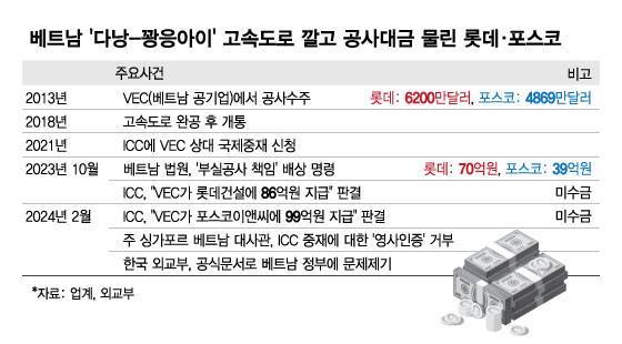 오히려 베트남 법에 따라 한국 건설사들이 100억원대 배상금을 낼 위기다. 베트남 하노이 인민법원은 지난해 10월 1심 재판에서 '다낭~꽝응아이 고속도로' 부실공사와 관련, 롯데건설이 70억원, 포스코이앤씨가 39억원 등 합계 약 109억원을 배상하라고 명령했다. 법원이 책정한 손해배상 금액은 각 시공사들의 입찰 패키지 규모에 상응하는 금액이다. 이 고속도로는 개통 직후 곳곳에 금이 가거나 포트홀(도로 파임) 현상이 일어나 부실공사 문제가 불거졌다.