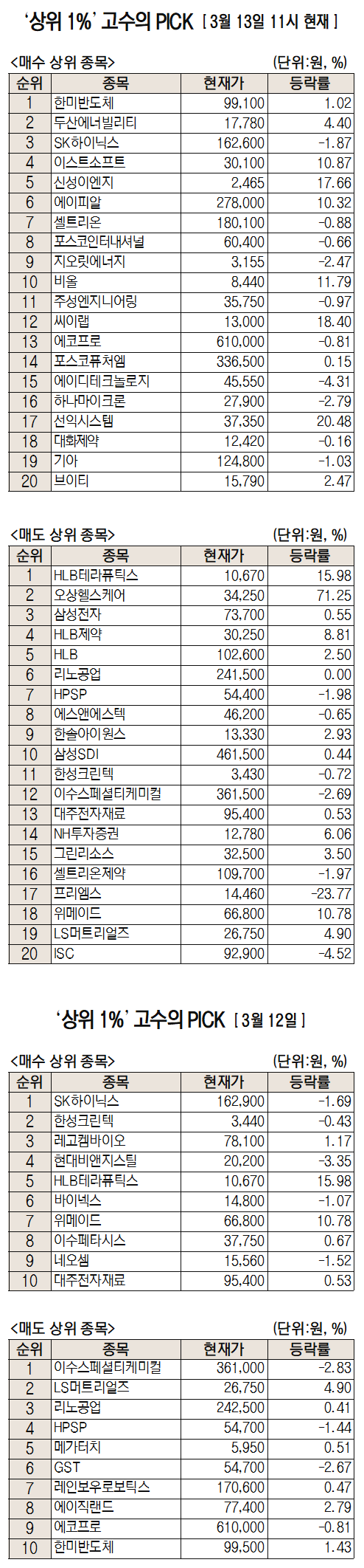 미래에셋증권은 자사 고객 중에서 지난 1개월간 수익률 상위 1% 투자자들의 매매 종목을 집계해 실시간·전일·최근 5일 기준으로 모바일트레이딩시스템(MTS)상에서 공개하고 있다. 이 통계 데이터는 미래에셋증권의 의견과 무관한 단순 정보 안내이며 각각의 투자자 개인에게 맞는 투자 또는 수익 달성을 보장하지 않는다. 또 테마주 관련종목은 이상 급등락 가능성이 있으므로 유의해야 한다.