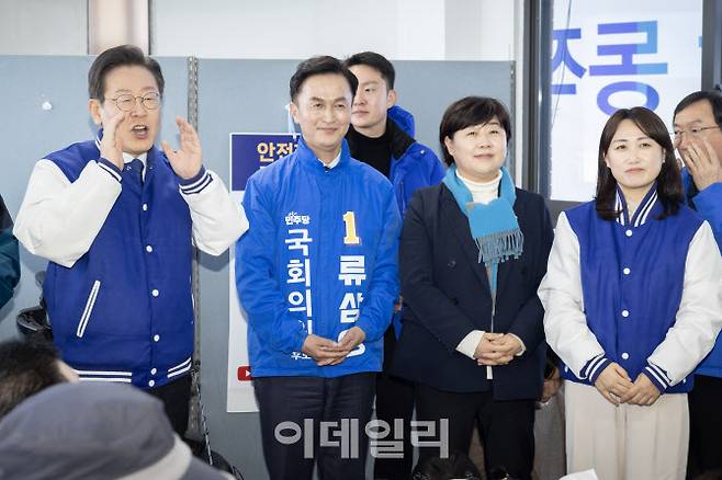 [이데일리 방인권 기자] 이재명 더불어민주당 대표가 13일 서울 동작구 류삼영 후보 사무실을 찾아 지지발언을 하고 있다.