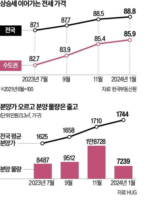 한국부동산원의 전국 아파트 전세가격지수 통계에 따르면 전국 아파트 전세가격지수는 지난해 7월 87.1을 기록하며 저점을 찍은 이후 올 1월까지 7개월 연속 상승하고 있다. 지난해 2월 전세가격지수가 89.8을 기록한 이후 11개월 만의 최고치다.