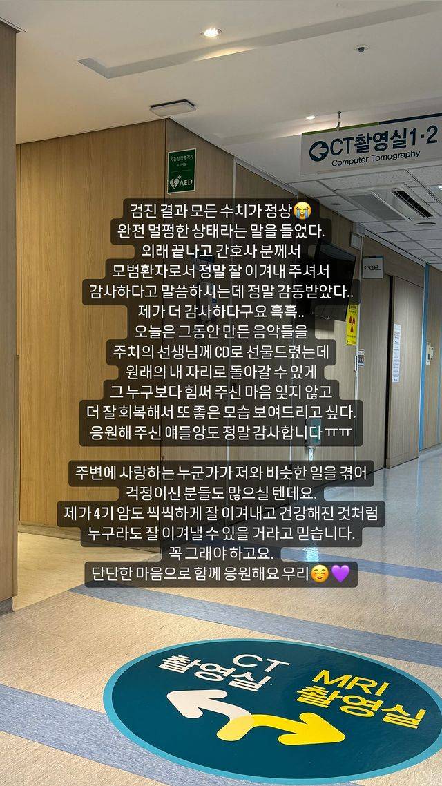 13일 안녕하신가영은 "검진 결과 모든 수치가 정상. 완전 멀쩡한 상태라는 말을 들었다. 외래 끝나고 간호사 분께서 모범 환자로서 정말 잘 이겨내 주셔서 감사하다고 말씀하시는데 정말 감동받았다"라는 글과 함께 병원에서 촬영한 사진을 올렸다.