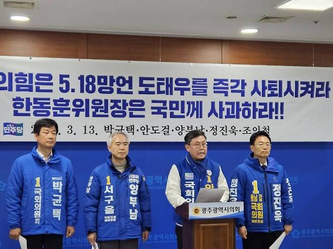 정진욱(광주 동구남구갑)·안도걸(광주 동구남구을)·조인철(광주 서구갑)·양부남(광주 서구을)·박균택(광주 광산구갑) 민주당 예비후보들은 13일 국민의힘에 후보 즉각 사퇴와 대국민 사과를 촉구했다.