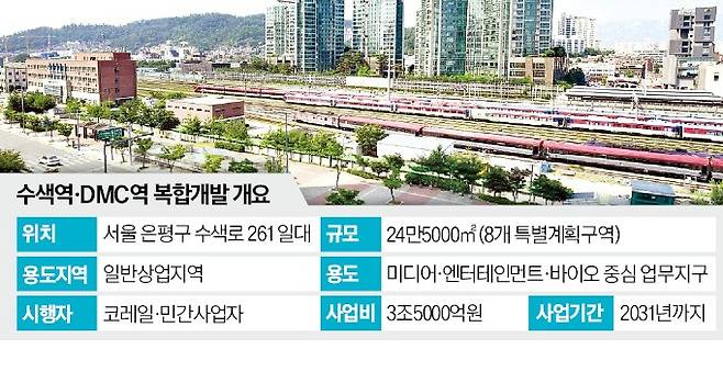 서울시는 수색차량기지를 고양시 덕은동 개발제한구역으로 옮기고 남북을 이어 상암동 일대 생활권을 재구성할 방침이다. 계획안에 따르면 은평구 수색로 261 일대(24만5000㎡)는 미디어·엔터테인먼트·바이오산업이 밀집한 업무지구와 컨벤션 시설로 탈바꿈한다. 소유주인 코레일이 민간사업자와 함께 총 3조5000억원을 들여 사업을 추진한다.