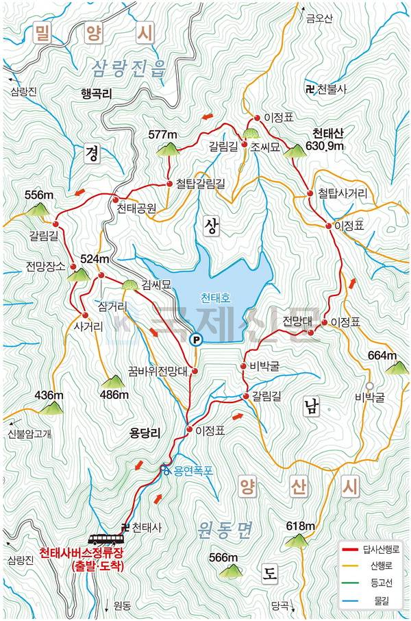 천성산(920.2m) 영축산(1082.2m)과 함께 양산 3대 명산이자 악산으로 이름을 올릴 만큼 천태산은 근교산 동호인의 사랑을 받아 왔다. 근교산 취재팀도 이에 호응해 원동면 용당리 동곡·중리마을에서 능선을 타고, 천태산을 거쳐 밀양 금오산과 연결하는 종주 산행과 삼랑진읍 안태리 안태호와 짧은 산길로 행곡리 숭촌고개에서 천태산을 오르는 다양한 등산로를 국제신문 지면에 알렸다.