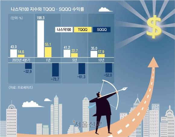 프로셰어즈에 따르면 지난해 4분기 나스닥100 지수가 14.60% 오를 때 TQQQ의 총 수익률은 3배가량인 42.99%에 달했다.