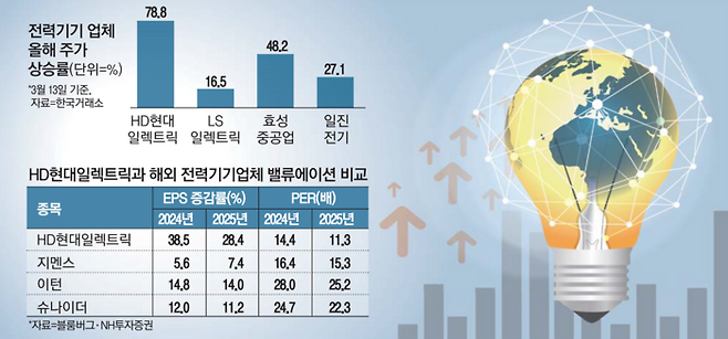 다만 13일 주가 급등으로 HD현대일렉트릭 주가는 목표 주가에 근접하거나 넘어선 상황이다. 시장의 성장성과 다른 글로벌 비교집단의 밸류에이션을 감안할 때 현재 주가 상승이 큰 부담이 아니라는 전망도 나온다. LS일렉트릭 역시 주가 급등에도 PER이 11배 수준이다.