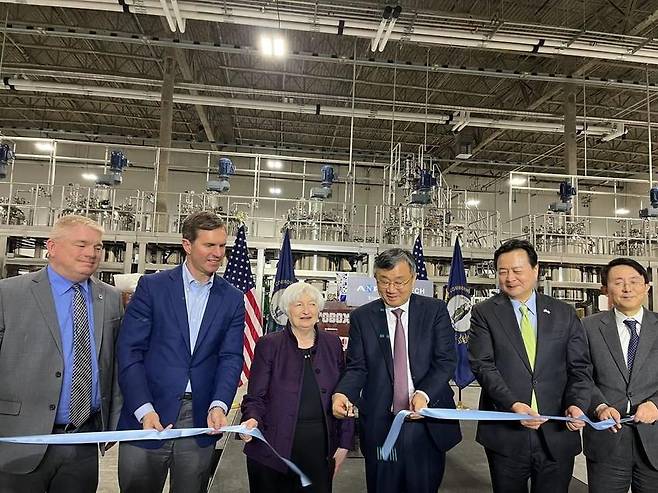 [재닛 옐런 미국 재무부 장관 등이 13일(현지시간) 켄터키주 엘리자베스타운의 한국기업 나노신소재에 방문해 테이프커팅식을 하고 있다. (주미 대사관 제공=연합뉴스)]
