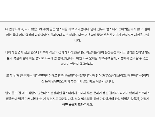 [동물이 건강한 집] 3세 고령의 햄스터, 배 안의 응어리와 피부 문제까지... 어떡하죠