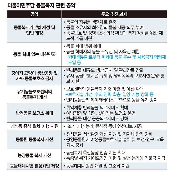 이번 민주당 공약엔 현행 동물보호법을 동물복지법으로 개정하고 동물들의 행복과 삶의 질 향상을 추구하겠다는 의지가 담겼습니다. 동물의 법적 지위를 물건이 아닌 생명체로 격상하는 등 21대 국회에 가로막혀 있는 "동물은 물건이 아니다"라는 내용의 민법 개정안을 재추진하겠다는 의미로도 해석되죠.