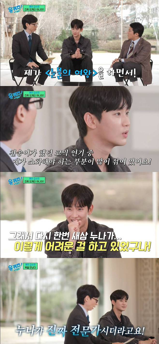 13일 방송된 tvN '유 퀴즈 온 더 블럭'(이하 '유퀴즈')에서는 '마이 데스티니' 특집으로 꾸며진 가운데 김수현이 출연해 다양한 이야기를 나눴다.