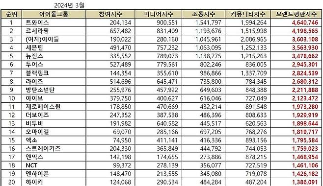 14일, 한국기업평판연구소에 따르면 2024년 2월 14일부터 2024년 3월 14일까지 빅데이터를 분석한 결과 걸그룹 트와이스가 아이돌그룹 브랜드평판 1위에 올랐다고 발표했다.