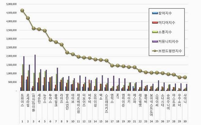 아이돌그룹 브랜드평판은 보이그룹과 걸그룹을 통합한 브랜드 카테고리 분석으로 아이돌그룹 브랜드에 대한 소비자들의 참여지수, 미디어지수, 소통지수, 커뮤니티지수를 측정하여 분석한다.