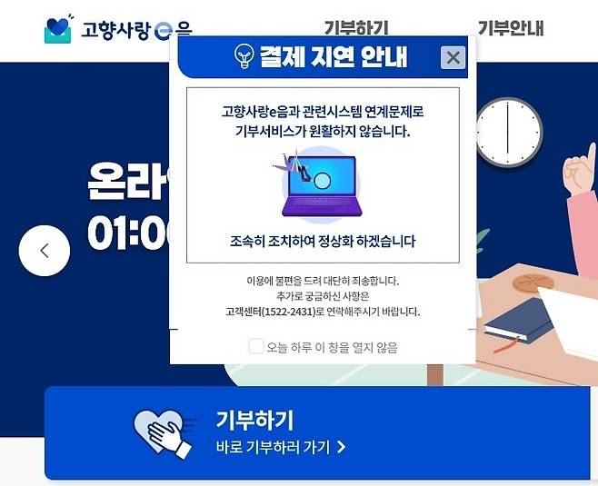 고객센터 관계자는 "차세대 세외수입시스템을 임시 점검 중"이라며 "오늘은 기부가 어렵다"고 설명했습니다.