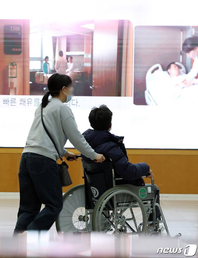 이날 서울의 한 대학 병원에서 환자와 보호자가 이동을 하고 있다. 2024.3.14/뉴스1