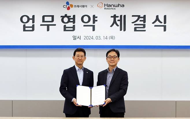 CJ프레시웨이가 로봇 전문 기업 한화로보틱스와 오늘(14일) 서울 마포구에 있는 CJ프레시웨이 서울 본사에서 업무협약을 체결했다고 밝혔습니다.
