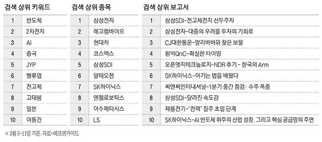 키워드 검색 순위에서는 '부동의 1위'인 반도체가 역시 최상위에 있었고, 2위는 2차전지, 그리고 3위는 글로벌 증시를 이끄는 인공지능(AI)이 차지했다.