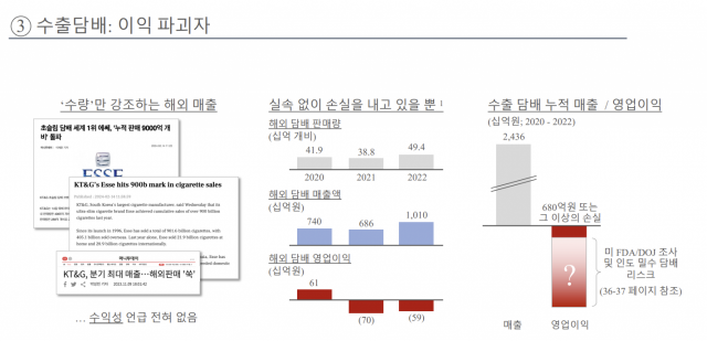 아울러 KT&G가 최근 3년간 해외에 궐련 담배를 수출하면서 이익을 내지 못하고, 누적 680억 원이 넘는 손실을 냈다고 주장했다.