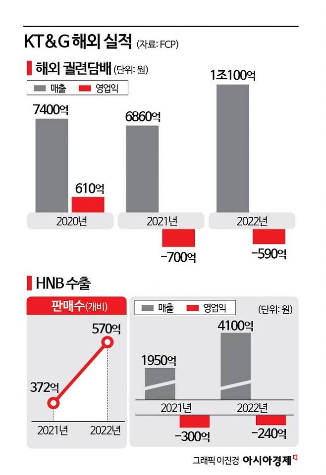 FCP에 따르면 KT&G는 해외 궐련 담배 사업과 HNB 수출 부문에서 모두 2년 연속 적자를 냈다. 해외 궐련 담배는 2021년 700억, 2022년엔 590억원의 영업손실을 기록했다. HNB 수출 부문 적자 규모는 2021년 300억, 2022년 240억원 규모였다. 이 대표는 "수출 실적을 구체적으로 공개하지 않아 법원에 정보 공개 가처분 신청까지 해서 얻은 자료"라며 "자료에 이의가 있다면 방 후보와 일대일로 토론할 의향도 있다"고 했다.