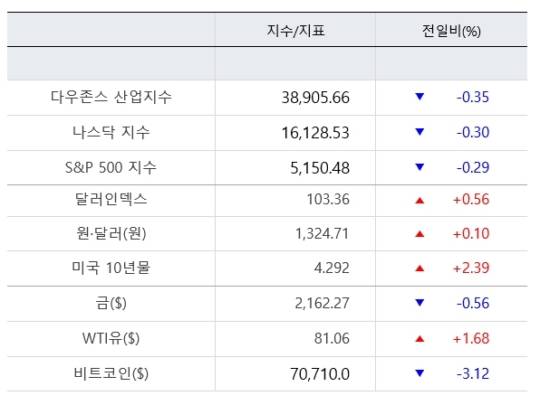14일(현지시간) 뉴욕증권거래소에서 블루칩을 모아놓은 다우존스 30산업평균지수는 전거래일 대비 0.35% 하락한 3만8905.66을 기록했다.