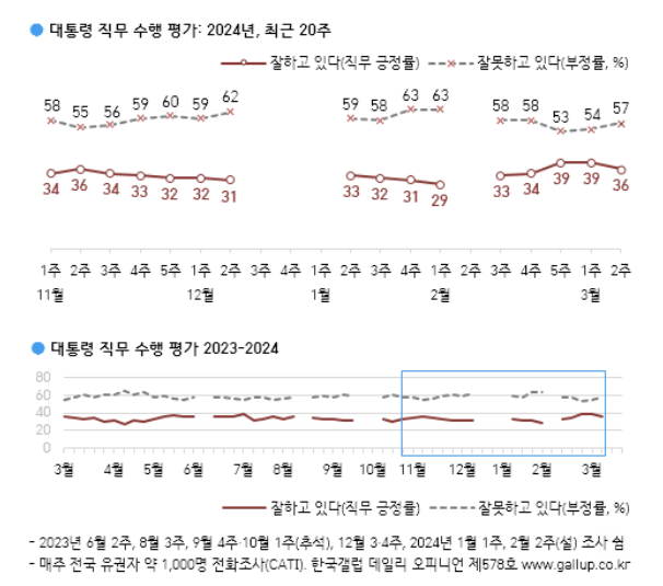 15일 여론조사업체 갤럽이 공개한 여론조사(자체 조사, 12~14일 전국 만 18세 이상 1002명 대상, 무선 100% 전화조사원 인터뷰 방식)에 따르면 윤 대통령의 직무수행에 대한 긍정 평가는 지난 조사보다 3%포인트 하락한 36%로 나타났다. 부정 평가는 3%포인트 오른 57%였다. 윤 대통령 지지율은 설 이후(2월 3주) 33%였지만, 지난주 39%까지 오르는 등 상승 흐름을 보였었다.