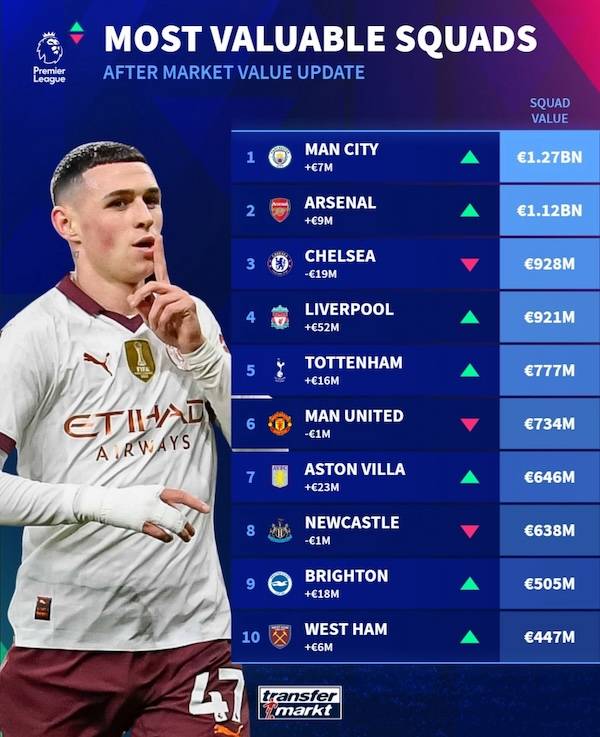 PL에서 가장 비싼 팀은 바로 맨체스터 시티였다. 매체에 따르면 맨시티의 가치는 12억 700만 유로(한화 약 1조 7,489억 원)였다. 필 포든, 엘링 홀란, 로드리, 후벵 디아스 등이 높은 가치를 기록한 것이 주요했다.
