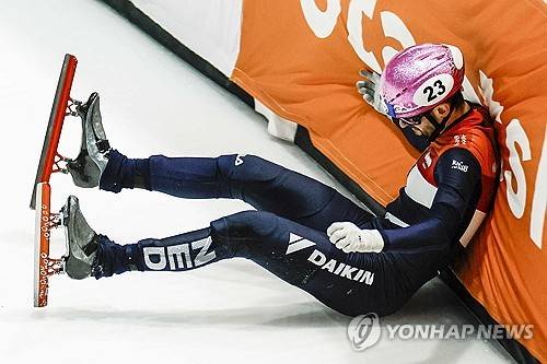 epa11222129 Itzhak de Laat of Netherlands falls during 1500 meters men's quarter-finals at the ISU Short Track Speed Skating World Championships in Rotterdam, Netherlands, 15 March 2024. EPA/Koen van Weel