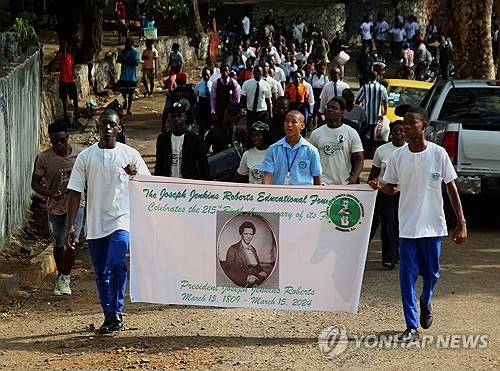 epa11222440 Students parade to mark the 215th birth anniversary of Liberia's first president Joseph Jenkins Roberts, in Monrovia, Liberia, 15 March 2024. The day is observed as a national holiday to commemorate the birth anniversary of Liberia's first president Joseph Jenkins Roberts. A black nationalist during the American slavery, Joseph Roberts immigrated to Liberia in 1829 at the age of 20, when the country was considered as a settlement for free slaves by the America Colonization Society (ACS). Roberts, was born in Petersburg, Virginia, USA, and became Liberia's first president, after the declaration of independence in 26 July 1847, and re-elected again in 1872, as Liberia's seventh president. Joseph Jenkins Roberts died in February 1876. EPA/AHMED JALLANZO