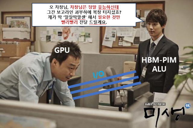 정리하자면 이 구조는 우리의 회사·조직 생활과 비슷합니다. 통상 상급자는 주로 업무에 필요한 자료를 처음부터 끝까지 조사하지 않죠. 각 부서에 배치된 직원들이 솎아내고 정리한 결과를 보고받아 의사결정을 합니다. HBM-PIM 속에 있는 ALU들이 회사에 있는 아주 유능한 직원들이라고 보시면 적당합니다.