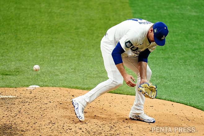 LA 다저스와 키움 경기에서 직선 타구를 흘리는 다니엘 허드슨.