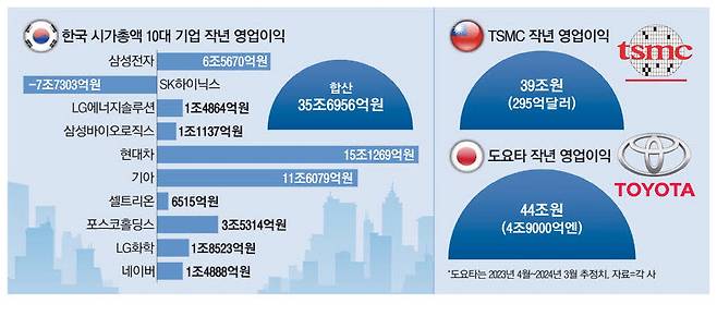 한국 증시 시가총액 상위 10개 종목의 영업이익을 모두 더해도 일본 대장주 도요타, 대만 대장주 TSMC에 미치지 못하는 것으로 나타났다.