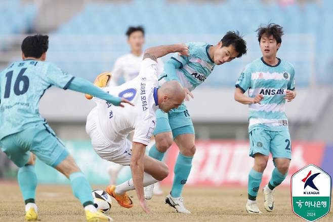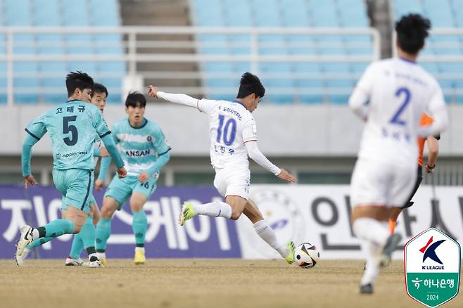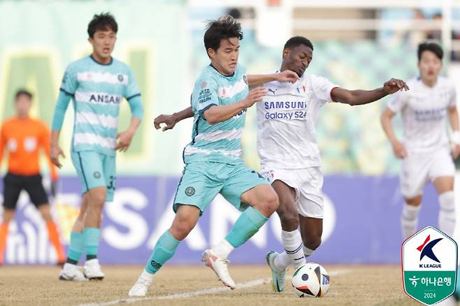 18분 수원이 선제골을 넣었다. 이종성이 올려준 코너킥을 한호강이 뛰어들며 머리에 맞췄다. 볼은 그대로 안산 골망을 흔들었다. VAR 결과 정심이 인정됐다.