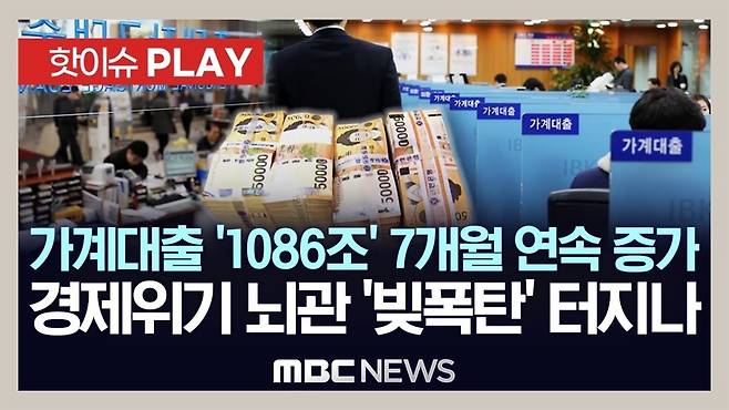 | ▲ 가계 대출의 위험을 알리는 뉴스 (가계대출 '1086조' 7개월 연속 증가..경제위기 뇌관 '빚폭탄' 터지나 - [핫이슈PLAY] MBC뉴스 2023년 11월 9일) |