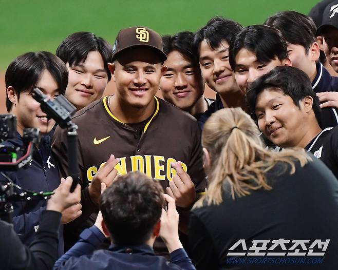 17일 서울 고척스카이돔에서 '메이저리그 월드투어 서울 시리즈 2024' 샌디에이고 파드리스와 팀 코리아의 경기가 열렸다. 경기 후 문동주, 원태인, 최지민 등선수들이 마차도와 기념촬영을 하고 있다. 고척=정재근 기자 cjg@sportschosun.com/2024.3.17/