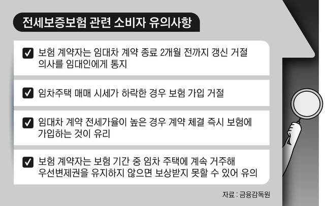 또 금감원은 임대차 계약 체결 즉시 보험에 가입하는 것이 안전하다고 강조한다. 임차주택 매매 시세가 떨어지면 보험 가입이 어려워질 수 있기 때문이다. 실제 최근 일부 지역에서 아파트 역전세 현상이 일어나자 임차인이 보증금을 반환받지 못할까 우려해 뒤늦게 보험 가입을 문의했다가 아파트 시세가 하락했다는 이유로 가입을 거절당하는 사례가 나오고 있다.