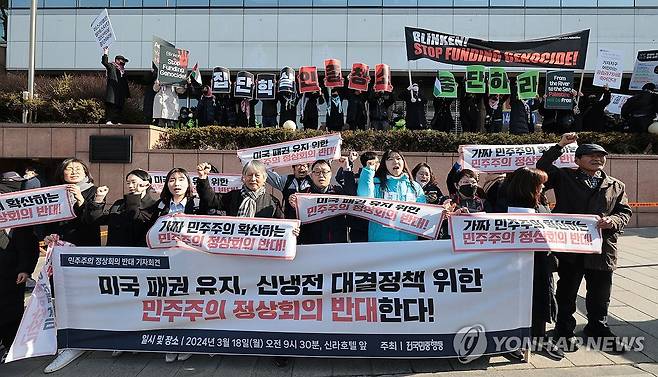 (서울=연합뉴스) 김인철 기자 = 18일 오전 서울 중구 동대입구역 앞에서 전국민중행동 관계자들이 민주주의 정상회의 개최 반대 기자회견(아래)을 하고 있다.