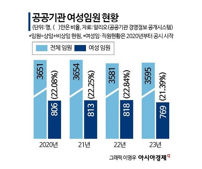 공공과 민간을 가리지 않고 여전히 유리천장이 공고하다는 점도 영향을 미쳤다. 알리오 데이터에 따르면 지난해 공공기관 전체 임원(상임 및 비상임·3595명) 중 여성 임원(769명)이 차지하는 비율은 21.39%에 불과하다. 여성 임원 비율은 공시가 시작된 2020년부터 줄곧 22%대를 유지하다가 지난해 21%대로 오히려 하락했다. 게다가 이 중 90%가량이 비상임이사로, 기관장을 포함한 상임임원은 10%에도 못 미친다.