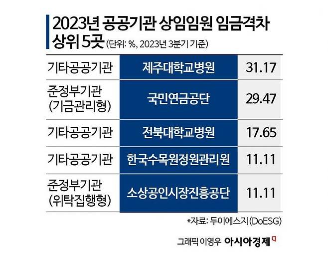 18일 아시아경제가 ESG 평가 전문기업 두이에스지(DoESG)를 통해 입수한 자료에 따르면 지난해 361개 공공기관의 남녀 상임임원 평균 임금 격차는 10.95%로, 2019년 7.30%에서 3.65%포인트 늘었다. 기관별로는 지난해 제주대학교병원의 상임임원 평균 임금 격차가 31.17%로 가장 높게 나타났다. 남성 상임임원이 100만원 받을 때 여성 상임임원은 약 70만원을 받은 셈이다. 이어 국민연금공단(29.47%), 전북대학교병원(17.65%), 한국수목원정원관리원(11.11%) 순이었다.