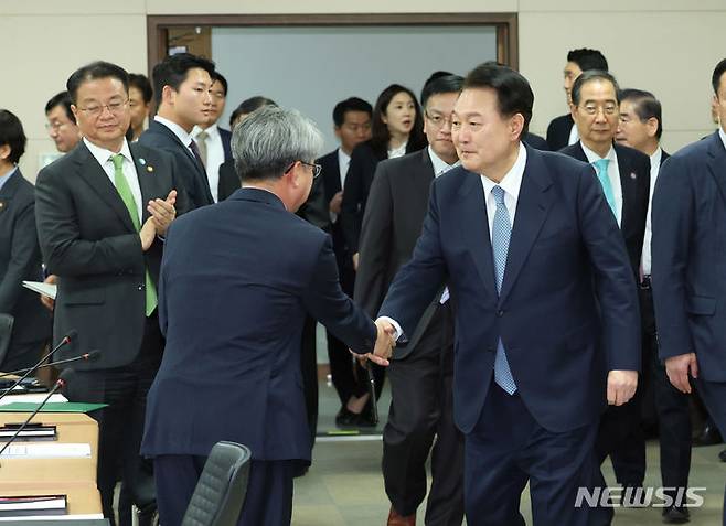 [서울=뉴시스] 조수정 기자 = 윤석열 대통령이 18일 서울 서초구 농협유통 인재개발원에서 열린 민생경제점검회의에 입장하며 김기성 수협중앙회 지도경제대표이사와 인사하고 있다. 2024.03.18. chocrystal@newsis.com