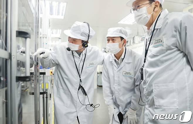 (서울=뉴스1) = 안덕근 산업통상자원부 장관이 18일 오후 LG에너지솔루션 오창 에너지플랜트에서 자동차 파우치형 배터리 생산라인 현장을 둘러보고 있다. (산업통상자원부 제공) 2024.3.18/뉴스1