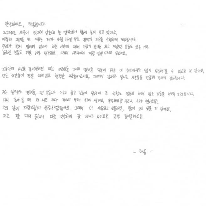그룹 엔시티(NCT) 멤버 태용이 자필 편지를 통해 입대를 앞둔 소감을 밝혔다.