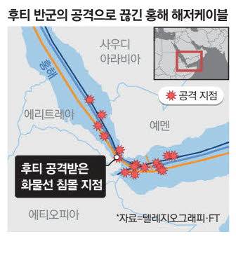 예멘 후티 반군 공격으로 지난달 침몰한 영국 상선 루비마르호 닻이 해저케이블을 찢었거나, 후티 반군이 고의로 테러했을 것으로 추정된다.