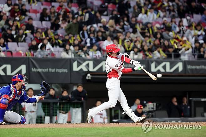 (광주=연합뉴스) 조남수 기자 = 18일 광주기아챔피언스필드에서 열린 프로야구 삼성 라이온즈와 KIA 타이거즈의 시범경기. KIA 박찬호가 3회말에 2루타를 때리고 있다. 2024.3.18