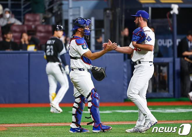 (서울=뉴스1) 김진환 기자 = 18일 오후 서울 구로구 고척스카이돔에서 미국프로야구(MLB) 공식 개막시리즈를 앞두고 열린 로스앤젤레스 다저스(LA)와 팀코리아의 경기, 경기가 끝난 뒤 2-5로 승리를 거둔 LA 다저스의 파이어라이젠 투수와 오스카 반스 포수가 기쁨을 나누고 있다. (공동취재) 2024.3.18/뉴스1