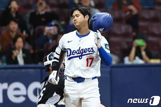 (서울=뉴스1) 김진환 기자 = 18일 오후 서울 구로구 고척스카이돔에서 미국프로야구(MLB) 공식 개막시리즈를 앞두고 열린 로스앤젤레스 다저스(LA)와 팀코리아의 경기, 1회말 무사 1루 3루수 파울플라이로 아웃된 LA 다저스 쇼헤이 오타니가 아쉬워하고 있다. (공동취재) 2024.3.18/뉴스1